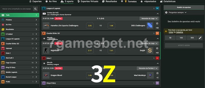 O 3Z oferece uma grande seleção de opções de apostas em e-sports com probabilidades competitivas